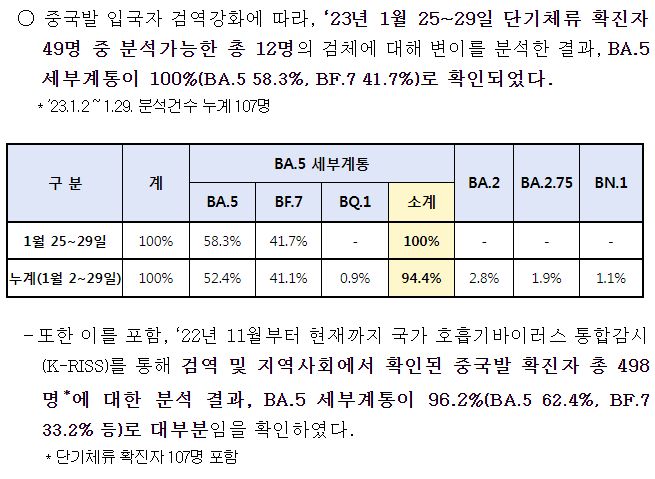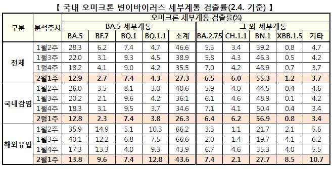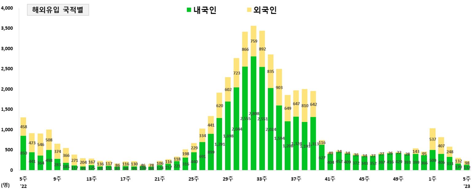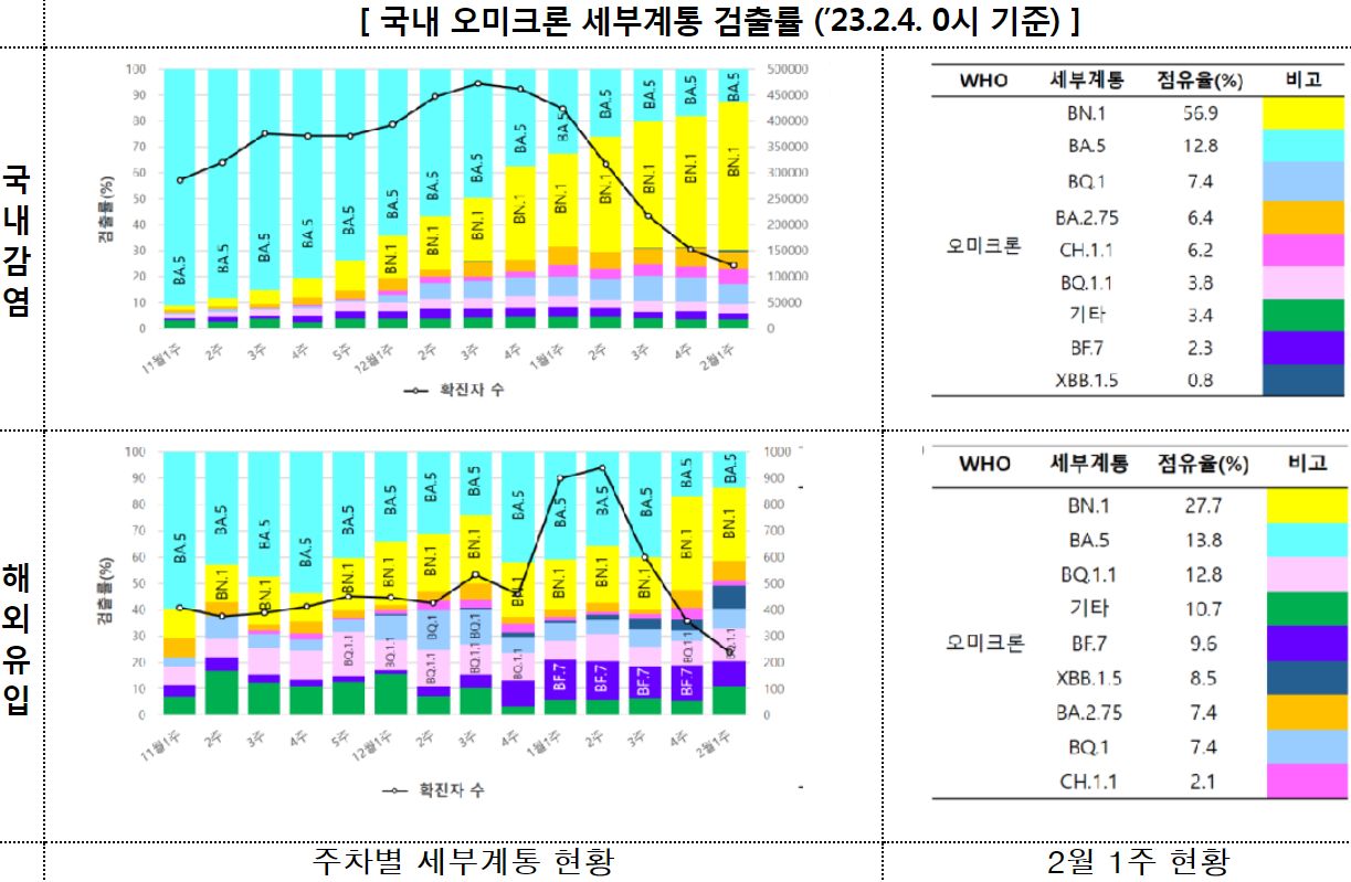 - 미국 내 발생이 증가하는 XBB.1.5는 21건 추가 검출(국내 13건, 해외유입 8건)되어, 누적 총 71건(국내 32건, 해외유입 39건)이 확인되었다.