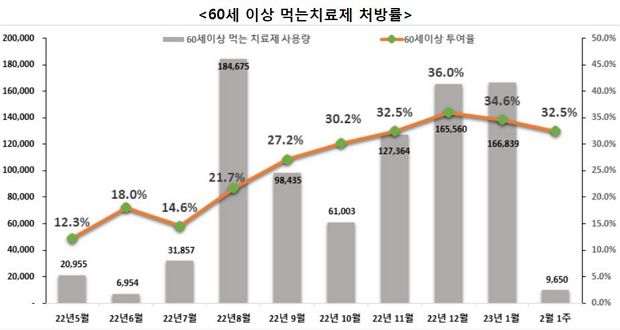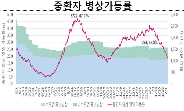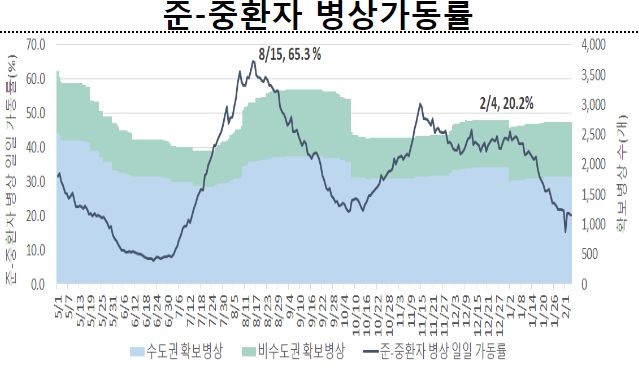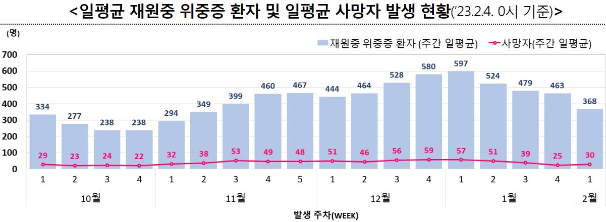 2월 1주 일평균 재원중 위중증 환자 중 60세 이상은 326명(88.6%), 일평균 사망자 중 60세 이상은 28명(96.6%).