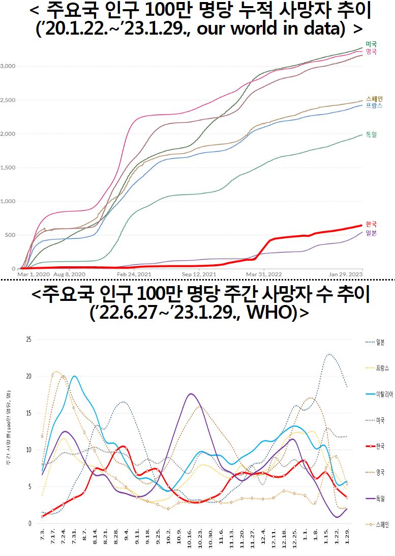 23년 2월 4일 기준, 전체 인구 10만 명당 코로나19 누적 사망률은 65.0명(치명률 0.11%). 80세 이상의 누적 사망률이 950.5명(치명률 1.96%)으로 가장 높고, 70대는 204.9명(치명률 0.45%), 60대는 53.1명(치명률 0.12%)