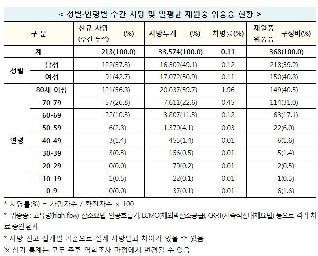 최근 1주간 연령대별 사망자 비중은 80세 이상이 56.8%, 70대가 26.8%, 60대가 10.3%로, 50대 이하 6.1%와 비교하면 고연령층 사망자가 대다수
