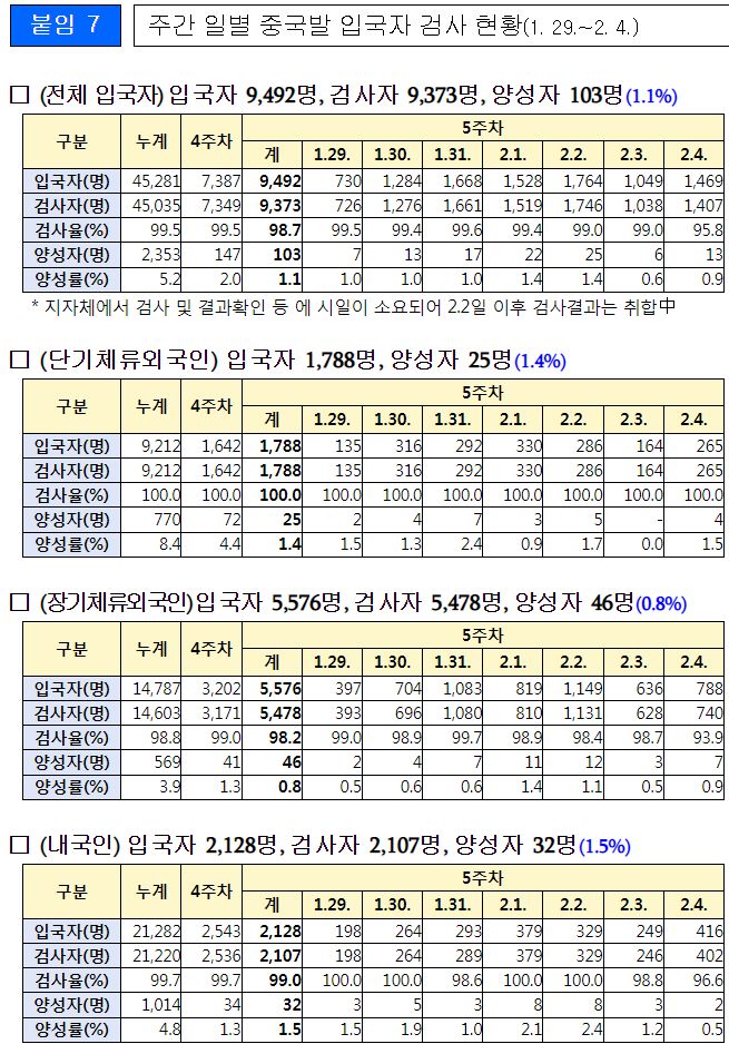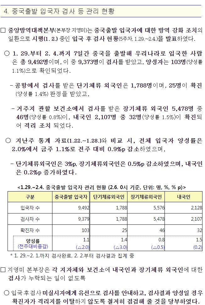 □ 중국출발 입국자 검사 등 관리 현황(1.29~2.4)