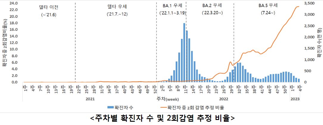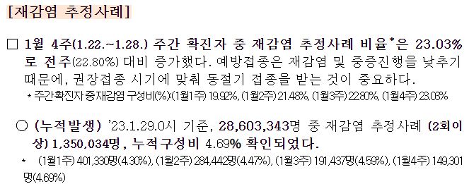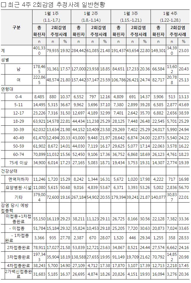 ○ 주간(1.22.~1.28.) 확진자 중 재감염 추정사례 비율 23.03%로 전주(22.80%) 대비 증가