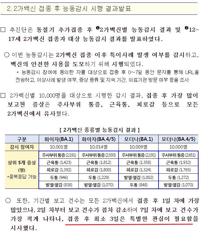 2가백신 접종 후 능동감시 시행 결과