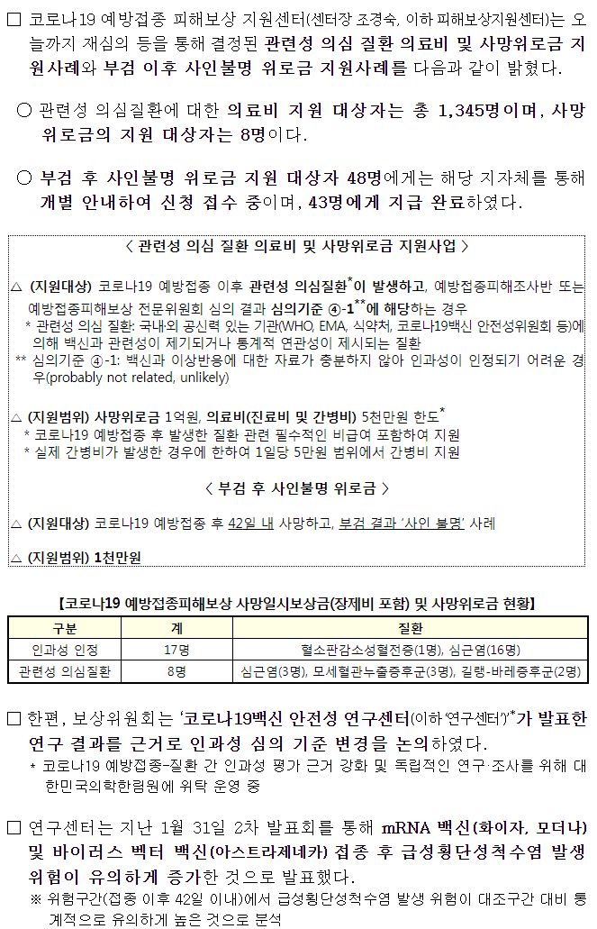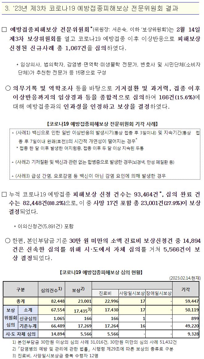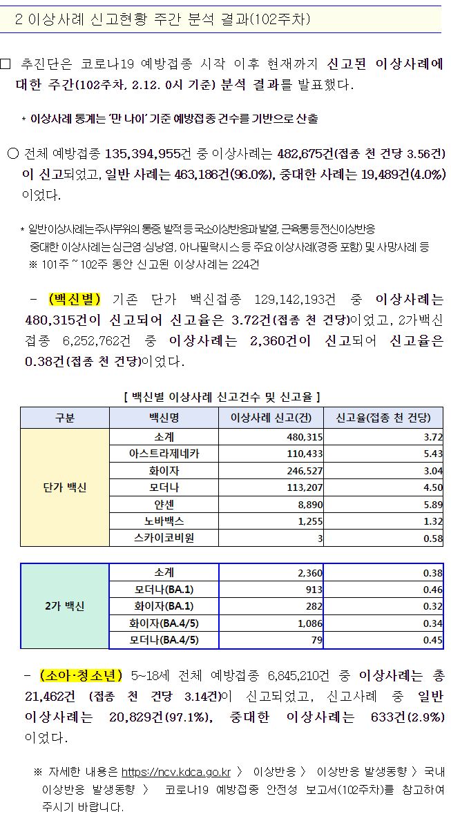코로나19(2023.2.16) 이상사례 신고현황 주간 분석 결과(102주차)/:/ '23년 제3차 코로나19 예방접종피해보상 전문위원회 결과/:/ 주간 예방접종통계 본문
