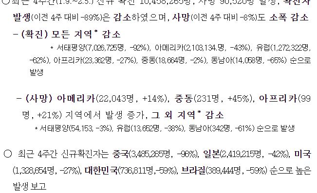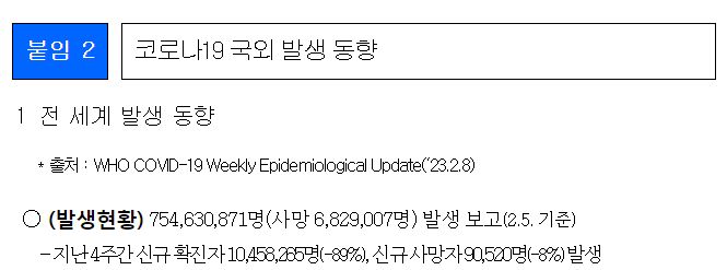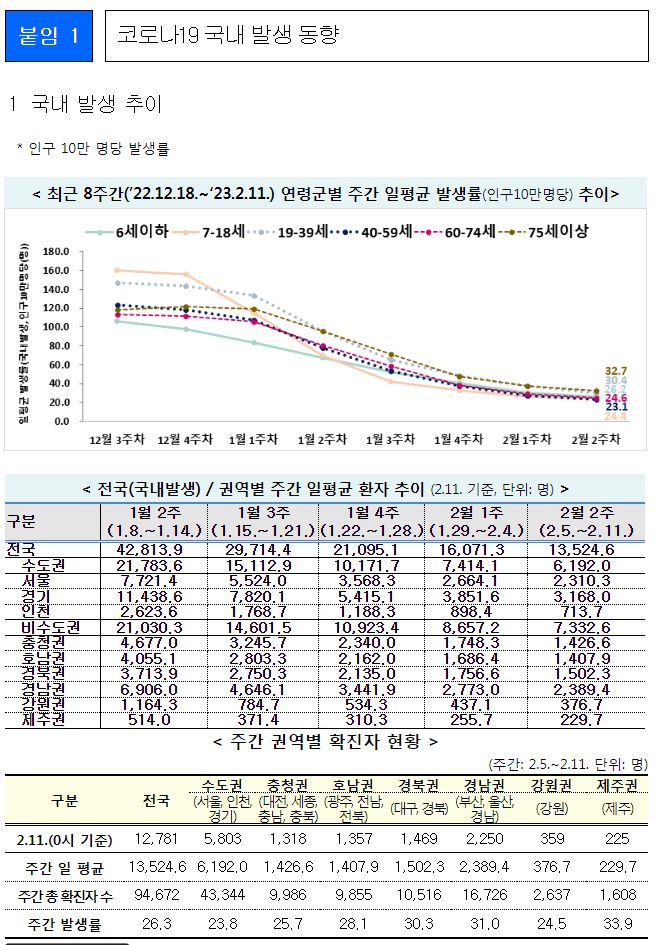 | 코로나19(2023.2.8.) 주간 발생 동향 및 위험도 평가(1.29.~2.4.) (0) | 2023.02.17 |