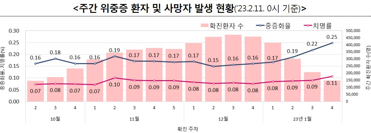 ○ 1월 4주차 확진자를 2주간 모니터링한 결과, 중증화율 0.25%, 치명률은 0.11%