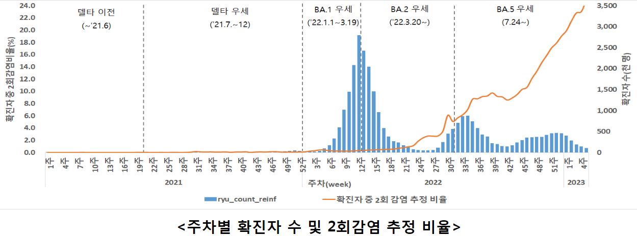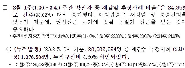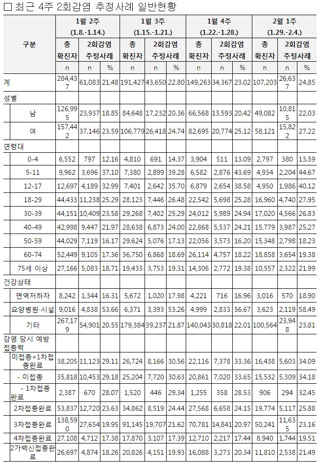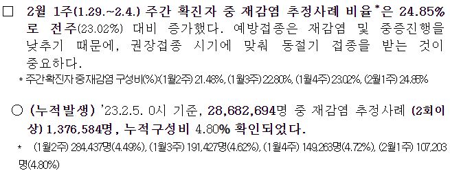 ○ 주간(1.29.~2.4.) 확진자 중 재감염 추정사례 비율 24.85%로 전주(23.03%) 대비 증가
