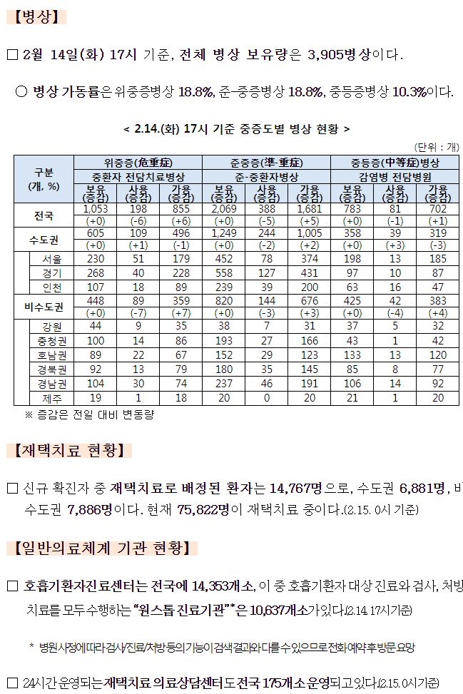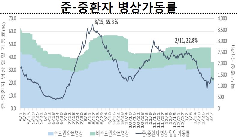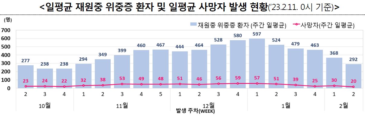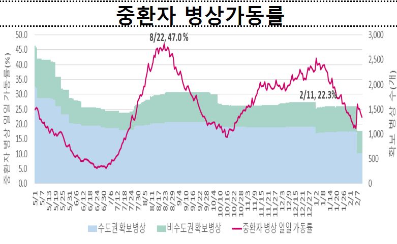 2월 2주 일평균 재원중 위중증 환자 중 60세 이상은 261명(89.4%), 일평균 사망자 중 60세 이상은 19명(95.0%).
