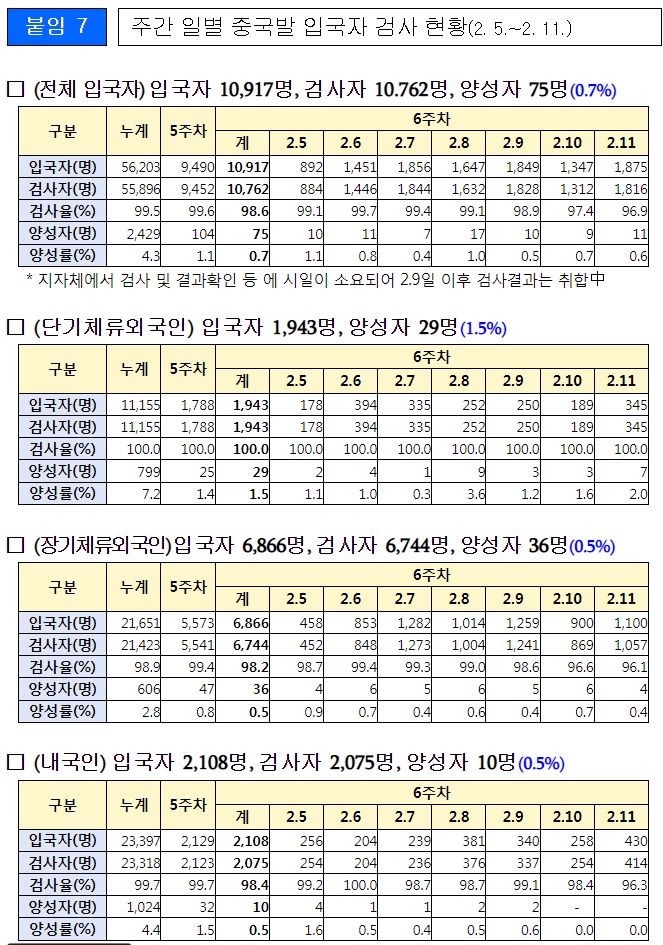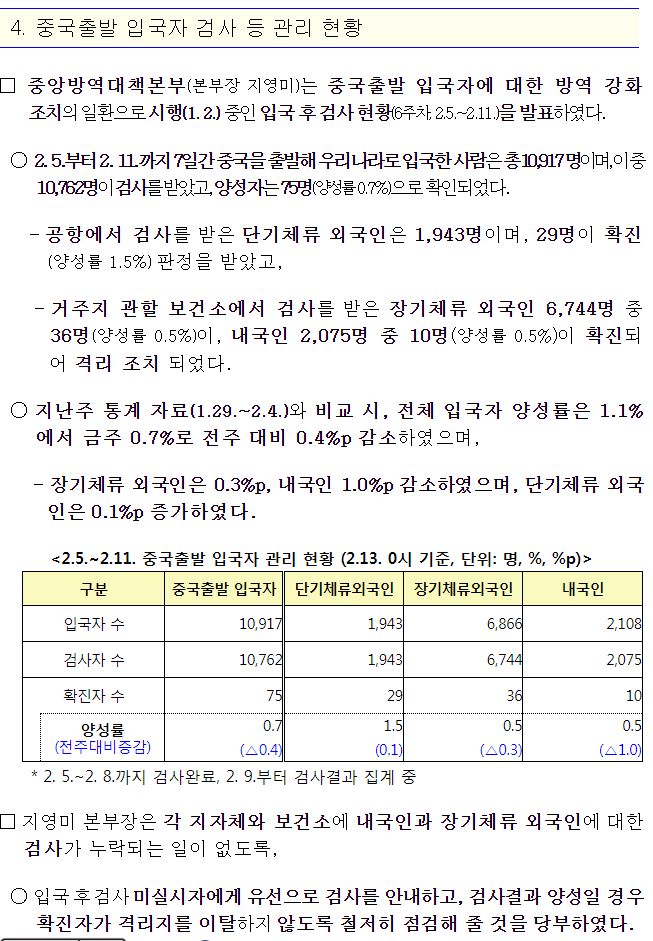 □ 중국출발 입국자 검사 등 관리 현황(2.5~2.11.)