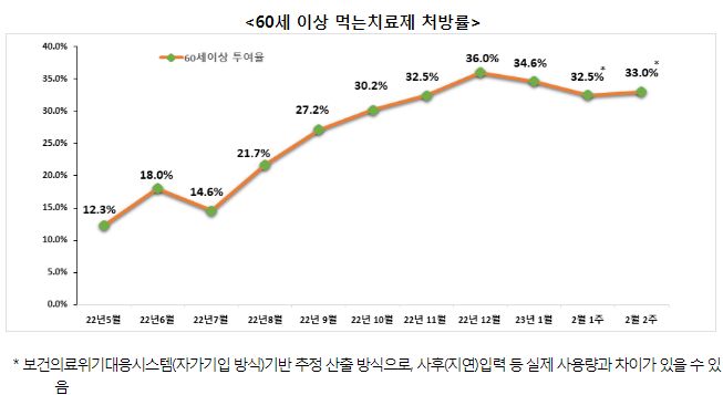** 60세 이상 비율(%): (1월3주) 28.2→ (1월4주) 26.2→ (2월1주) 26.3→ (2월2주) 26.9