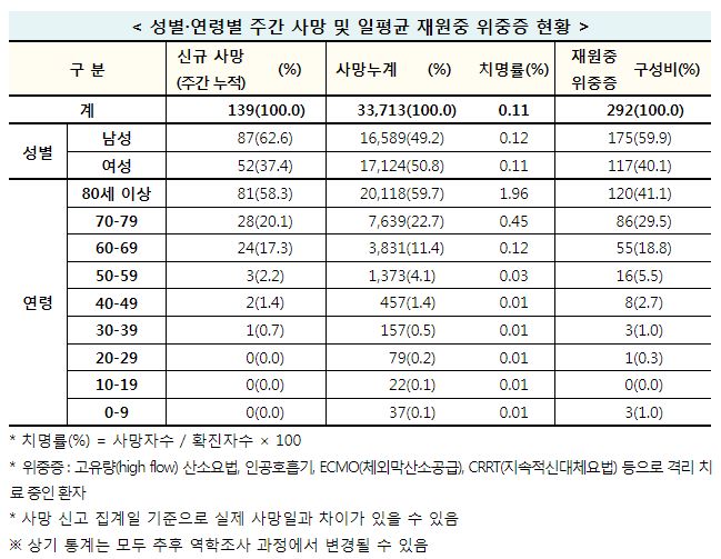 ※ 일평균 재원중 위중증 환자 중 50세 이상 277명(94.9%), 일평균 사망자 중 50세 이상 20명(100.0%)