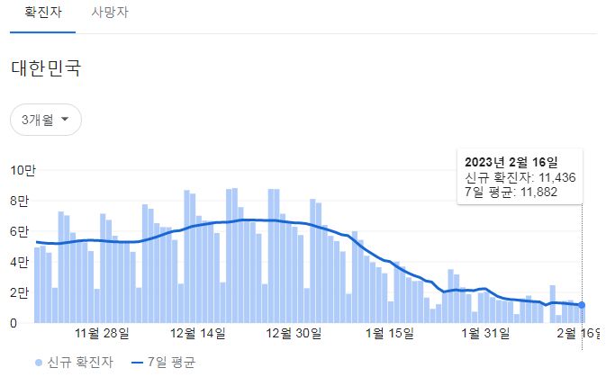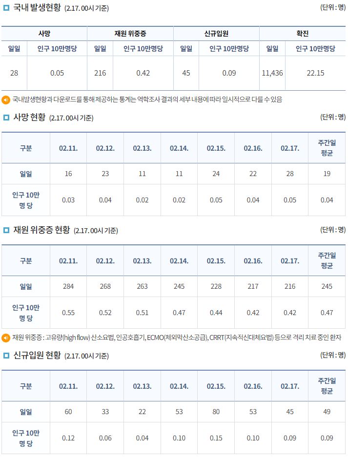 코로나19집계(2023.2.17. 0시기준) 확진 +1.1만, 사망 +28명, 중환자병상가동률 18% 본문