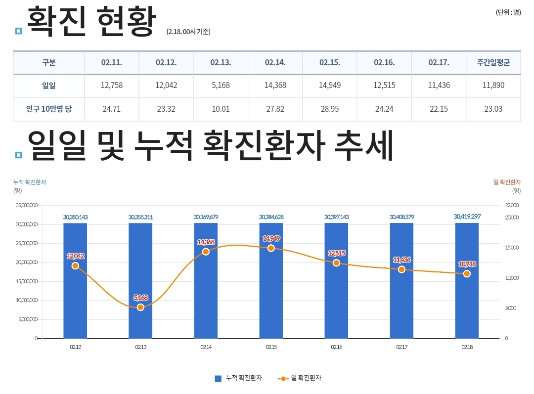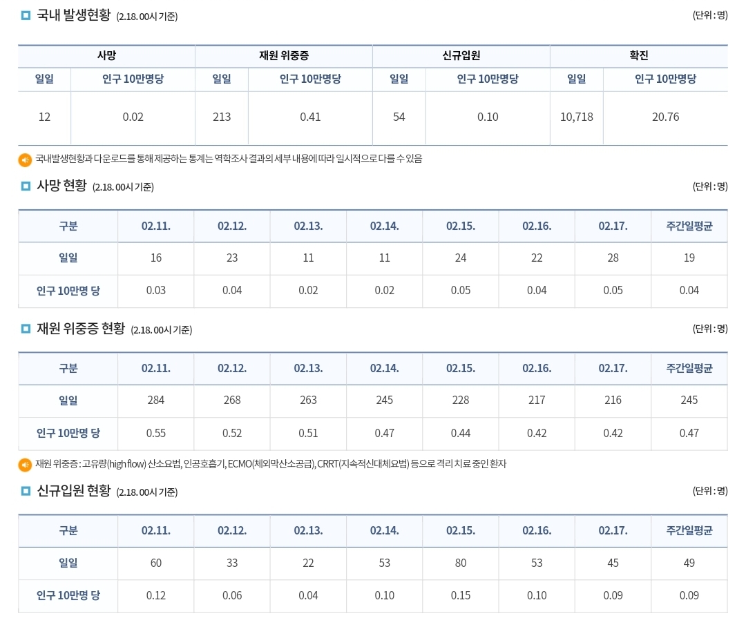 코로나19집계(2023.2.18. 0시기준) 확진 +1.1만, 사망 +12명, 중환자병상가동률 17% 본문