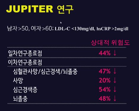 JUPITER연구: 콜레스테롤수치가 표준보다 조금 높고 염증수치가 있는 사람(LDL수치가 아주 높은 사람들에게는 윤리상 대조군을 만들 수 없으니까)