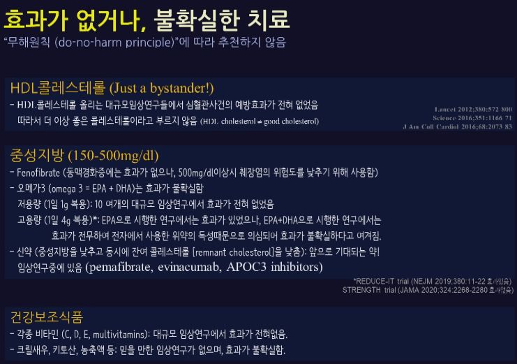 ( HDL섭취많이 하기, 중성지방을 많이 먹기, 오메가3먹기, 건강보조식품먹기 ) => 이런 거 하지 마라!