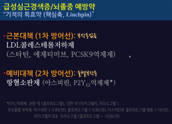 금성심근경색증과 뇌경색은, 콜레스테롤찌꺼기가 쌓인 부분의 표면을 세포가 덮어 생긴 "동맥경화반"이 파열되면 피떡(혈전)이 혈관을 막아 생긴다. 이 파열을 막는 것이 예방이고 콜레스테롤약과 아스피린.