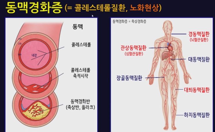 ㅡ 동맥경화증(관상동맥질환, 뇌혈관질환)은 수도관이 녹슬 듯 동맥의 내막에 콜레스테롤 찌꺼기가 쌓여서 발생하게 되며, 세월이 흐르면 누구에게나 찾아오는 일종의 노화현상이다.