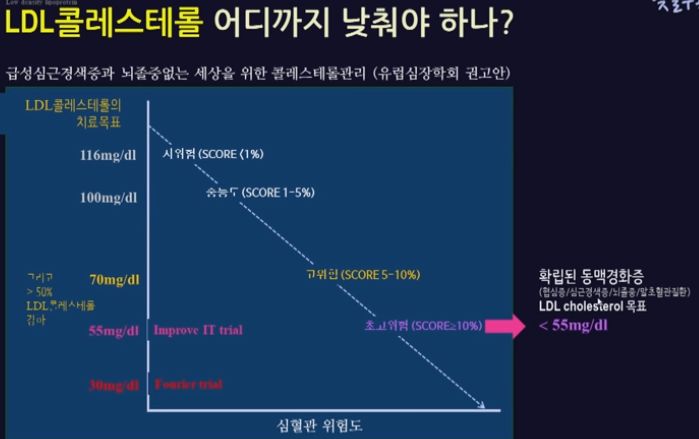 혈증 LDL콜레스테롤의 측정수치가 아주 낮아도 잔여 콜레스테롤이라는 게 혈관벽에 쌓여 혈전을 만들 수 있다. 그게 문제가 되는 환자도 있을 수 있다고..