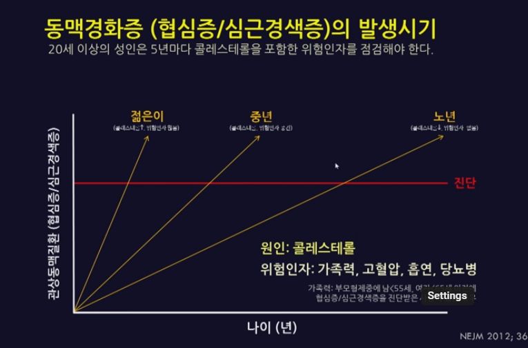 ㅡ 콜레스테롤(원인)이 높거나, 위험인자(가족력, 당뇨병, 고혈압, 흡연)가 많으면 젊은 나이에, 그렇지 않으면 노년에 발생한다.