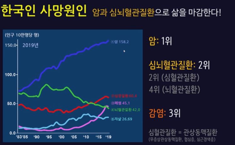 ㅡ 핏줄은 동맥경화증으로 망가지며 그로 인한 심뇌혈관질환이 주요 사망원인이다.