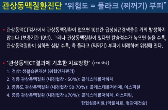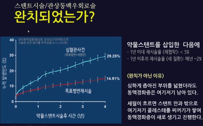ㅡ 관상동맥스텐트시술과 관상동맥우회로술은 완치가 아니며 심장사의 고위험군이어서 평생 예방관리(콜레스테롤저하제, 아스피린)를 해야 한다.