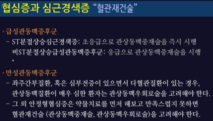 ㅡ 만성관동맥증후군(좌주간부질환 혹은 심부전증이 있으면서 다혈관질환. 관상동맥질환이 매우 심하면 관상동맥우회로술 고려) 안정형협심증은 약물치료를 먼저 하고 만족스럽지 못하면 혈관재건술(관상동맥중재술, 관상동맥우회로술)을 고려