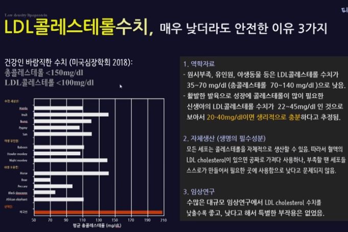 혈중 LDL콜레스테롤의 권장치는 하한이 없다. 일반인은 무조건 낮을수록 좋다고 알아도 된다.
