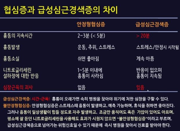 ㅡ 운동이나 스트레스시에 흉통이 있으면 검사를 받아라. 조금만 움직여도 아프거나 흉통이 심해지면 응급실을 찾아야 한다.