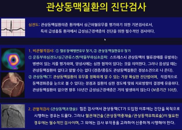 ㅡ 비관혈적 검사: 운동부하심전도/심근관류스캔/약물부하초음파(여기서 양성이 나오면 진단. 다만 음성일 때는 정상이라고 확신하지 못한다), 관상동맥CT(가장 확실하다)