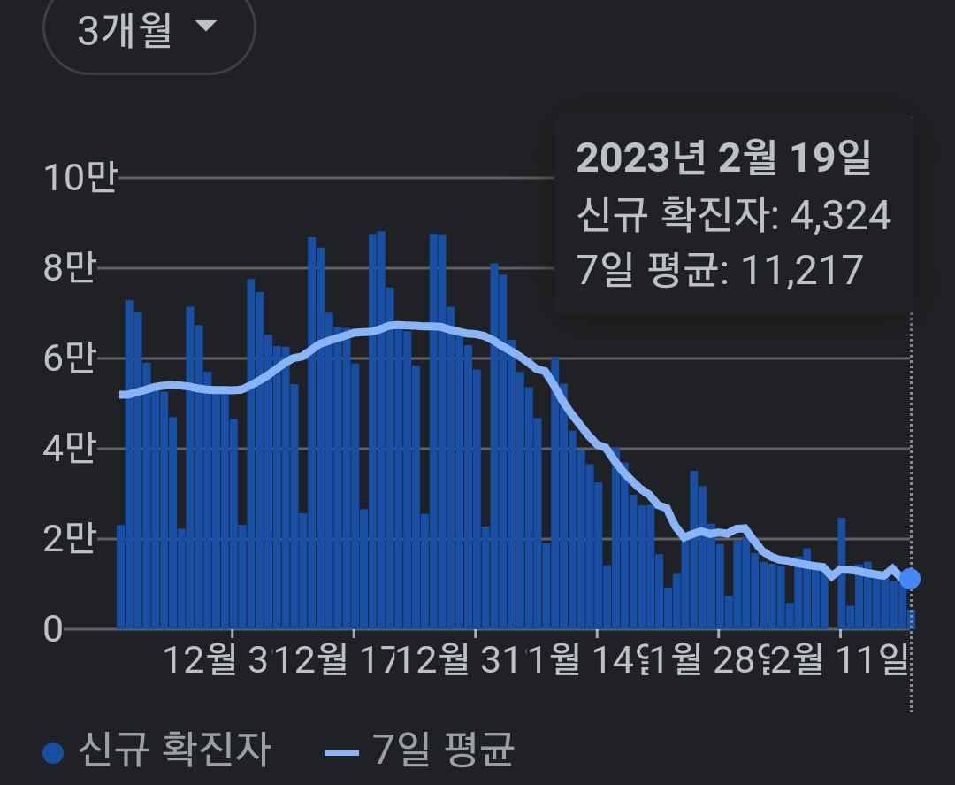 | 코로나19집계(2023.2.19. 0시기준) 확지 +1.0만, 사망 +12명, 중환자병상가동룰17 % (0) | 2023.02.19 |
