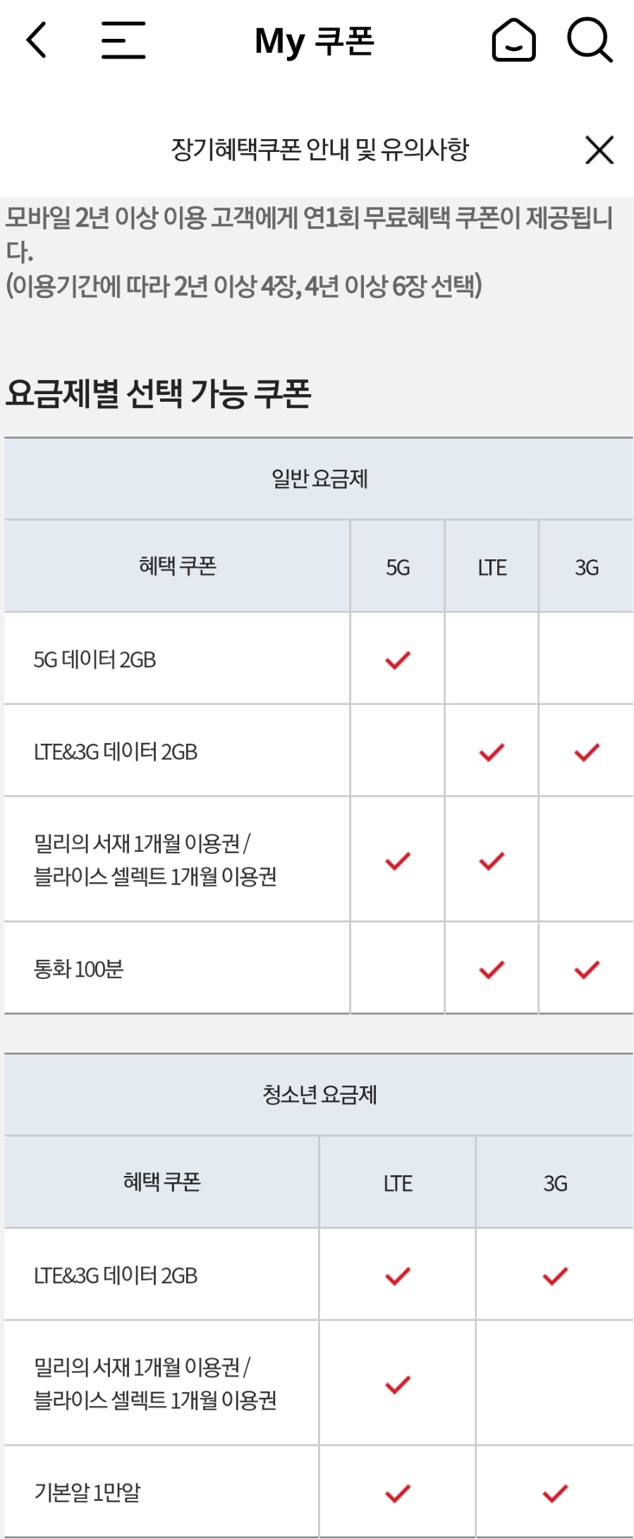장기혜탁쿠폰은 2년 이상 이용 중인 가입자에게 연간 4장이나 6장을 주는데(매년 가입일), 1장당 통화 100분이나 데이터 2기가짜리고 쿠폰을 등록하면 쓰고 남은 용량은 다음 달 말까지 유효합니다. 그래서 이용하던 요금제 데이타, 통화가 부족한 달에 쓰기 좋습니다.
