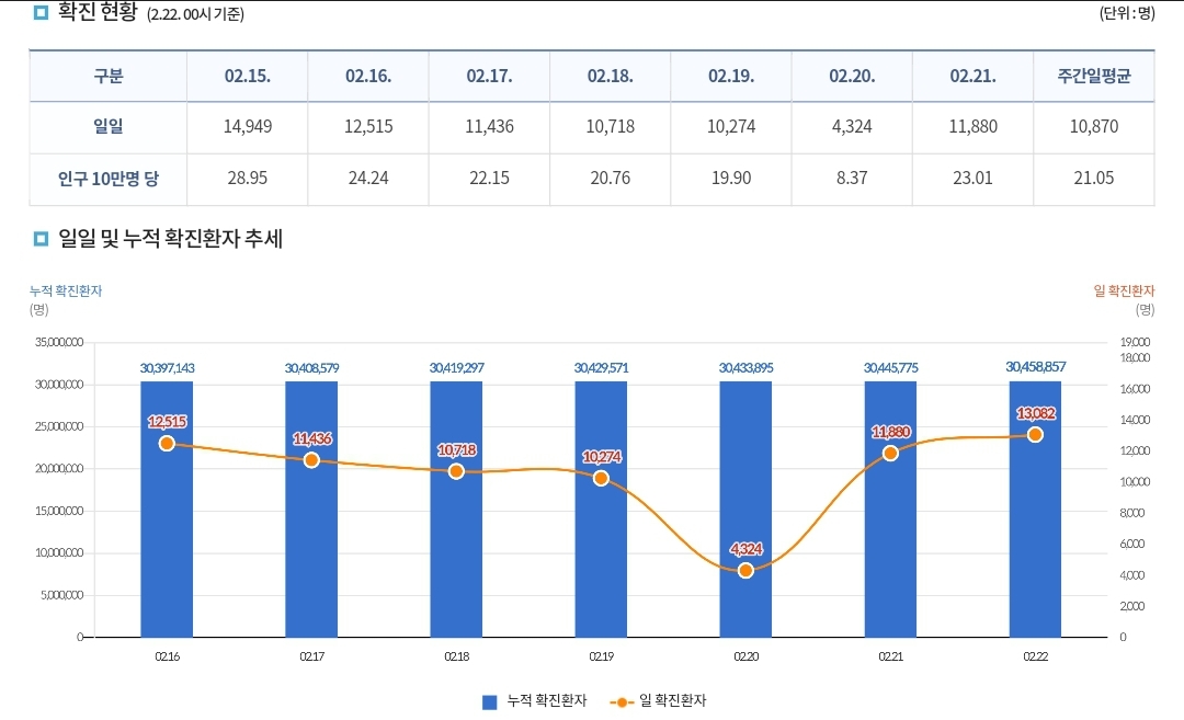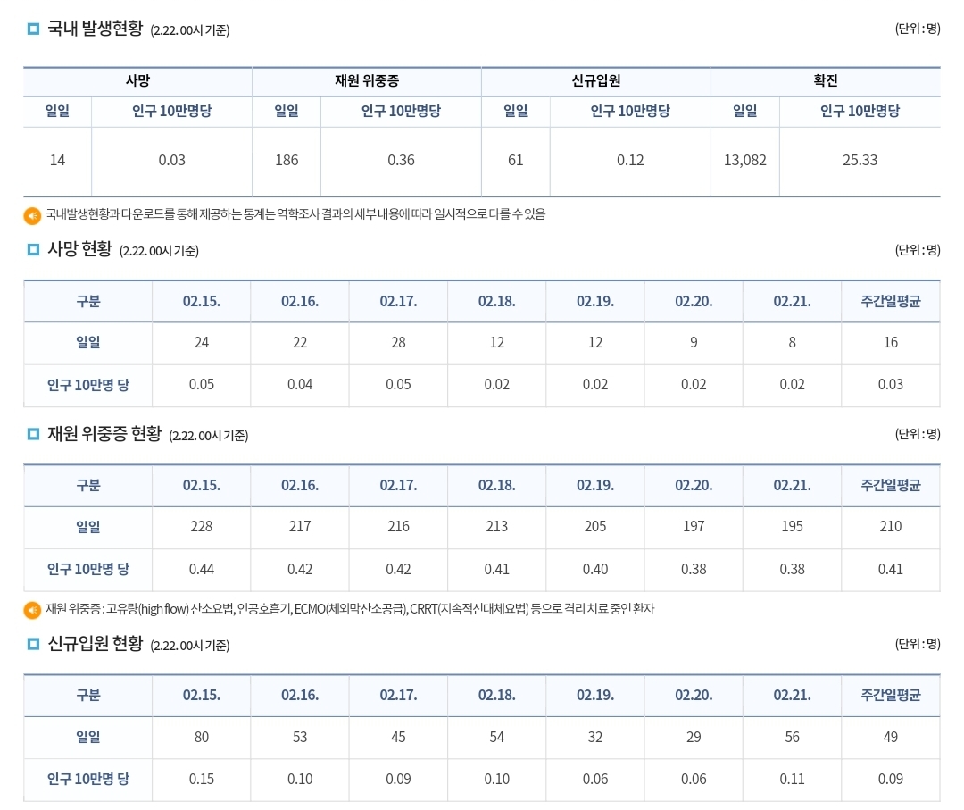 코로나19집계(2022.2.22. 0시기준) 확진 +1.3만, 사망 +14명, 중환자병상가동률 16% 본문
