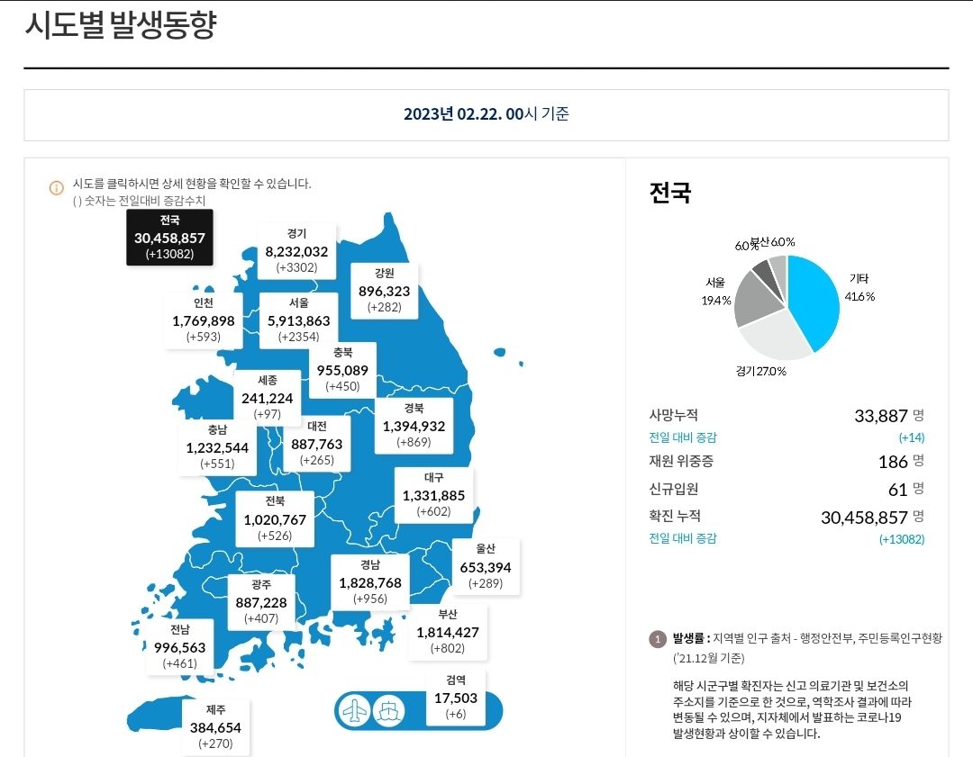 | 코로나19집계(2023.2.23. 0시기준) 확진 +2.2만, 사망 +22명, 중환자병상가동률 16% (0) | 2023.02.23 |