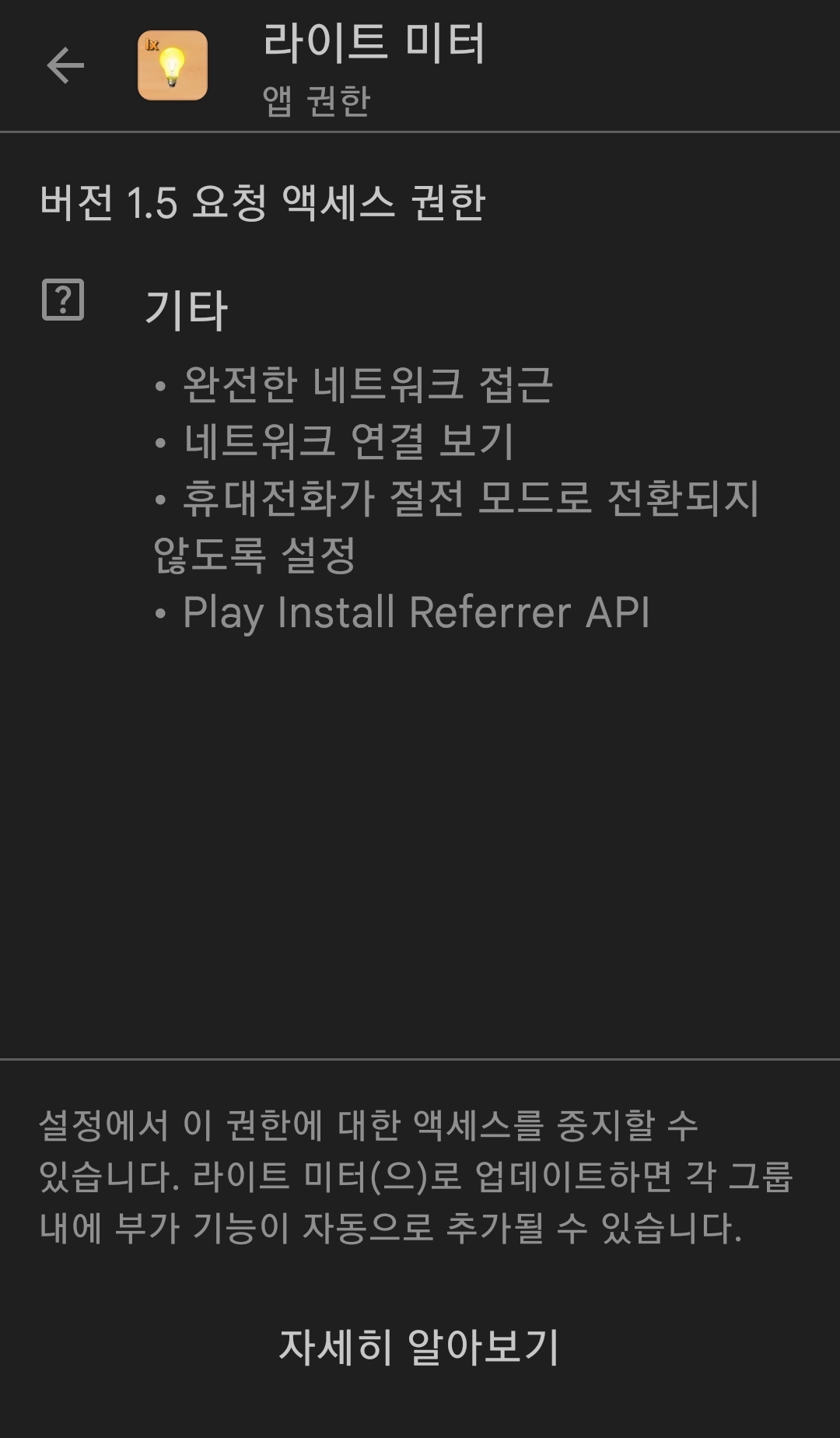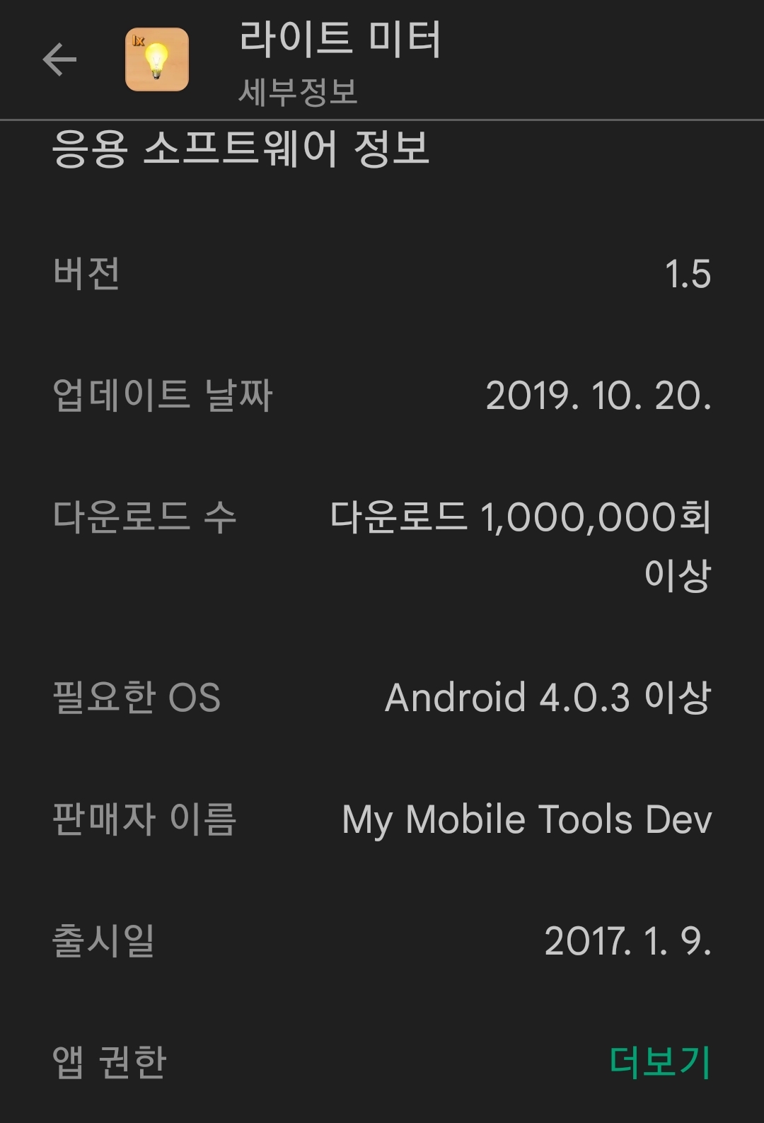 스마트폰 조도계앱은 많이 나와있는데, 이걸 고른 이유는 권한을 적게 요구하기 때문입니다. (그러니까 더 적게 요구하는 앱이 있으면 그게 더 좋겠죠)
