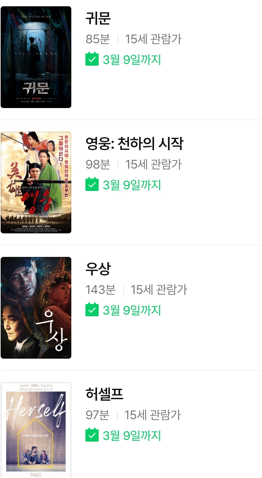 ~3.9까지.. 귀문, 영웅:천하의 시작, 우상, 허셀프, 내겐 너무 소중한 너, 펭귄-위대한 모험2