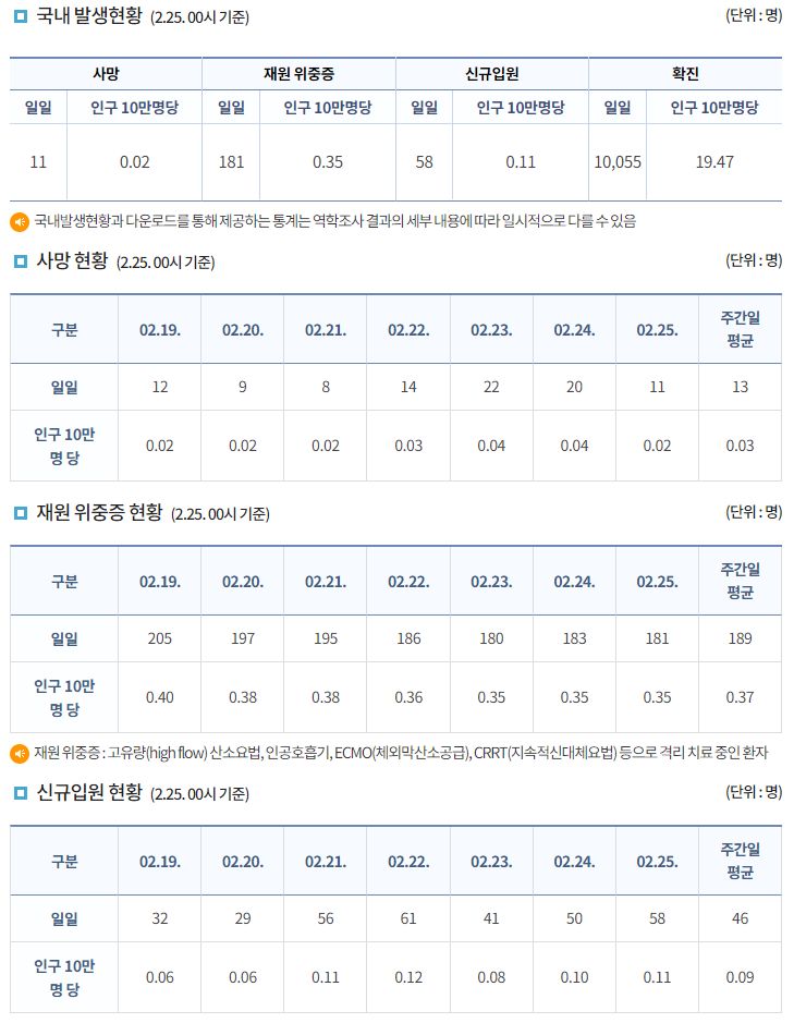 | 코로나19집계(2023.2.25. 0시기준) 확진 +1.0만, 사망 +11명, 중환자병상가동률 14% (0) | 2023.02.25 |