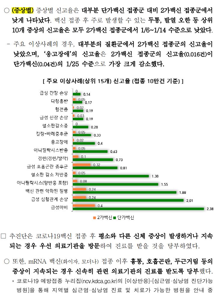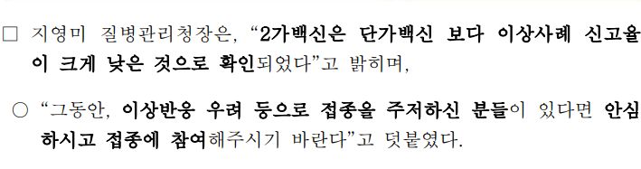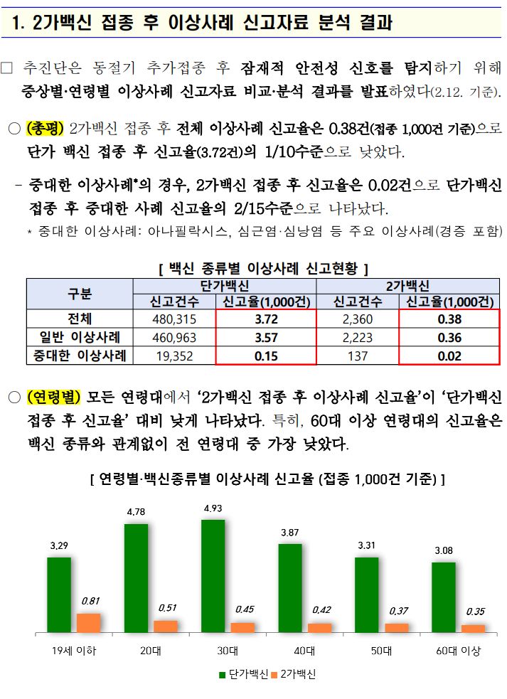 2가백신, 이상사례 신고율 단가백신의 10분의 1 - 60대 이상이 가장 낮은 것으로 나타나 -