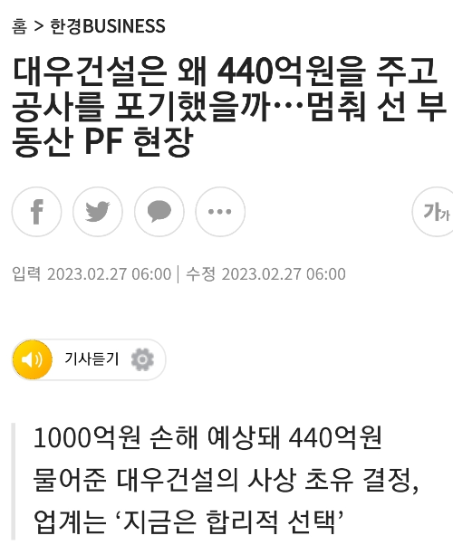 부동산PF(프로젝트 파이낸싱)에 관한 기사 하나: 대우건설의 손절 본문