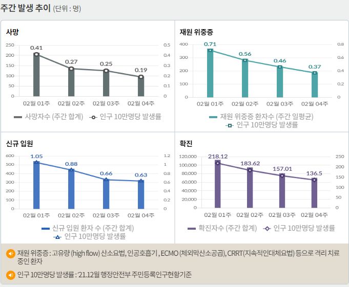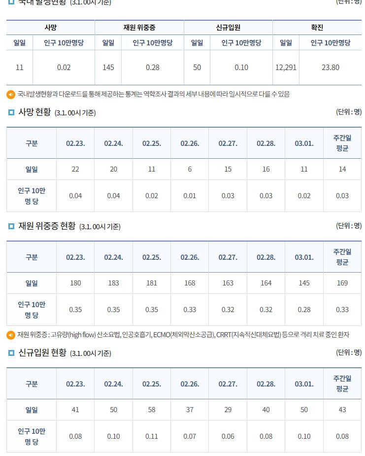 | 코로나19집계(2023.3.1. 0시기준) 확진 +1.2만, 사망 +11명, 중환자병상가동률 13% (0) | 2023.03.01 |