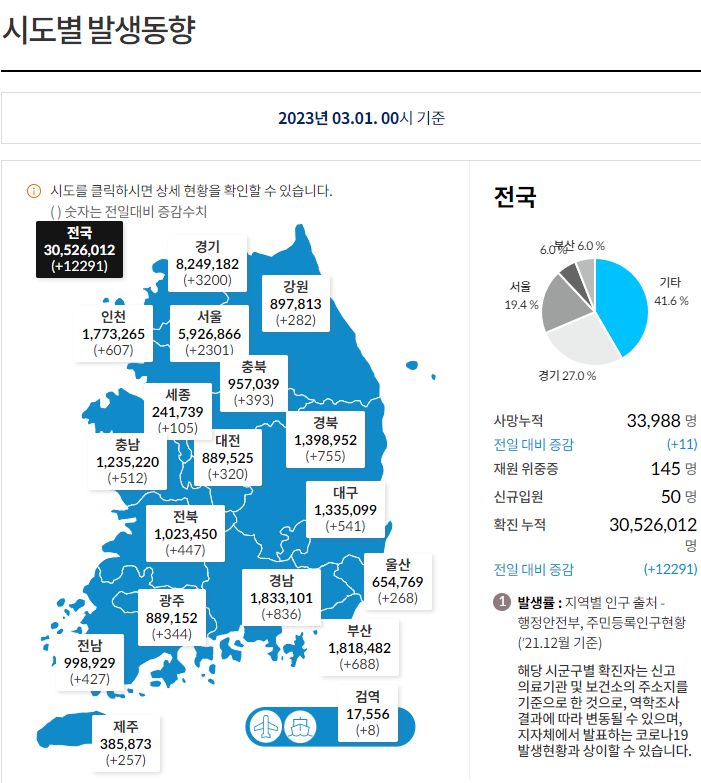 코로나19집계(2023.3.1. 0시기준) 확진 +1.2만, 사망 +11명, 중환자병상가동률 13% 본문