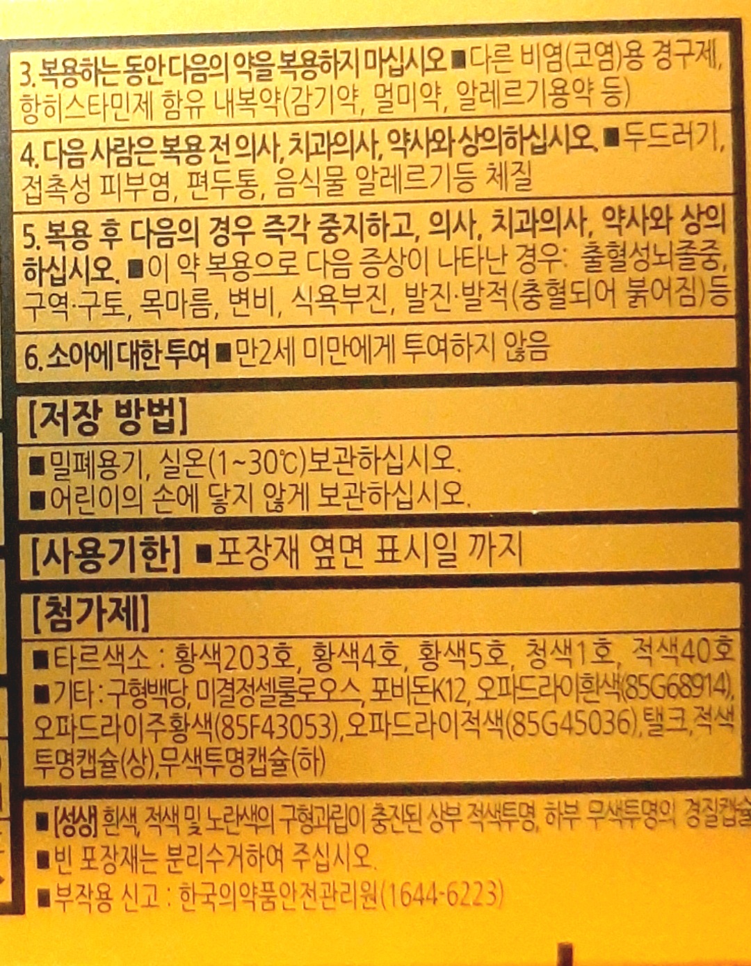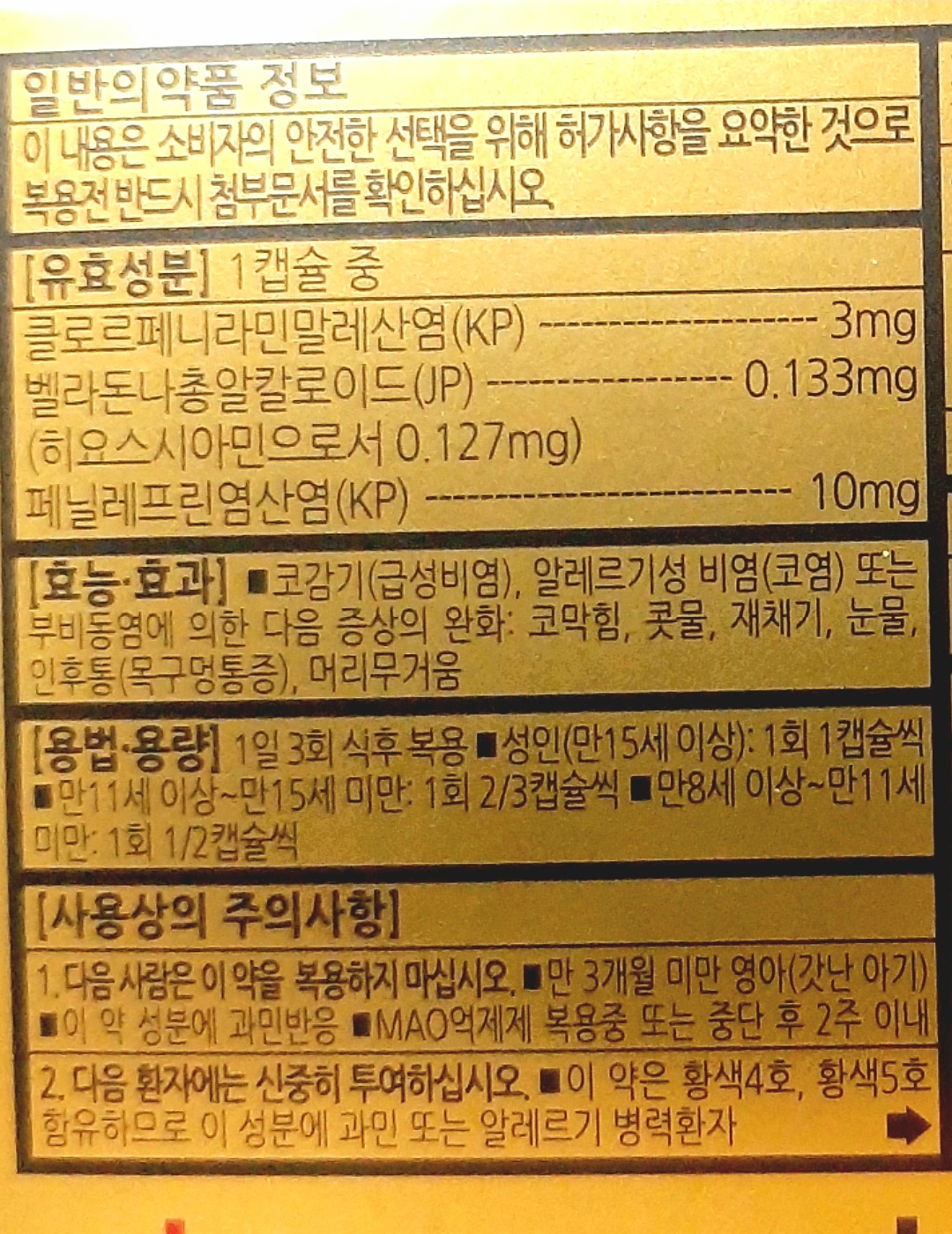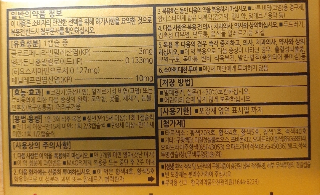 ※ 이 약은 일단 페닐에프린이 들어있는데, 약갑에는 고혈압환자에 대한 주의사항은 안 적혀있습니다. 하지만 주의사항 자체는 있습니다. 가장 중요한 이슈는 아니고 다른 약과 마찬가지로 길어서 약갑에는 다 못 적은 듯. 식품의약품안전처에 등록된 이 약의 정보를 보면 나옵니다.