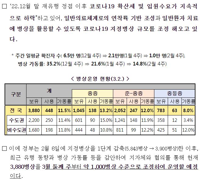 - 현재 확보된 지정병상 3,880개를 3월 둘째 주부터는 약 1,000병상 수준으로 추가 감축하여 운영할 예정