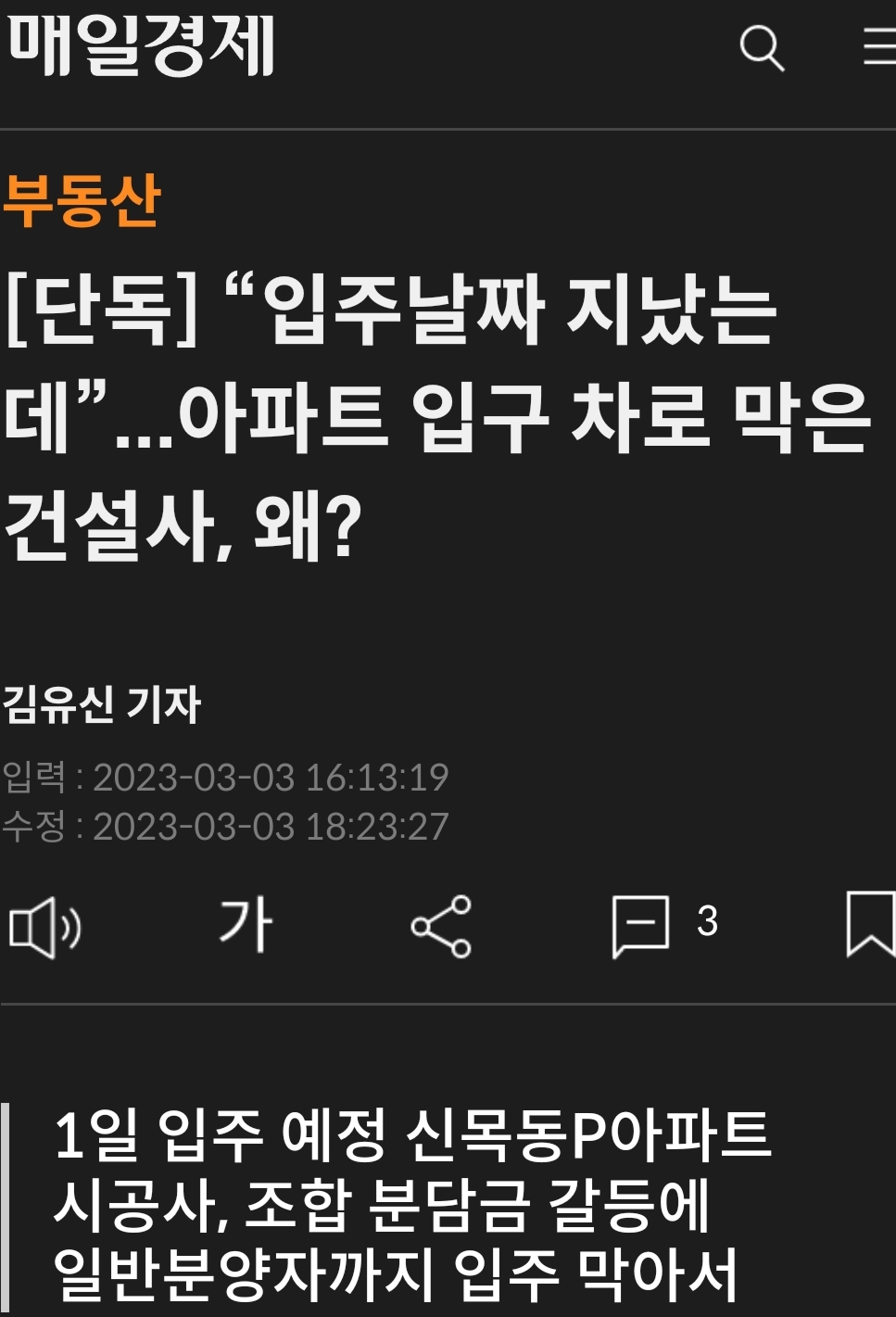신목동파라곤 입주 예정자들의 입주일이 기약 없이 미뤄 (......) 조합에 따르면 시공사 측은 공사비 인상을 이유로 조합이 100억원 안팎의 추가 분담금을 지급할 것을 요구(......) 받아들이지 않자 조합원과 함께 일반 분양자도 입주하지 못하도록 아파트 출입 통제 (......)