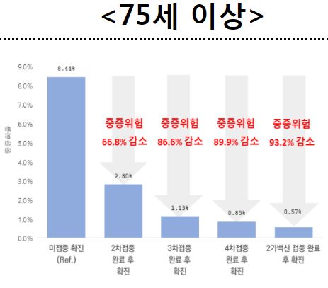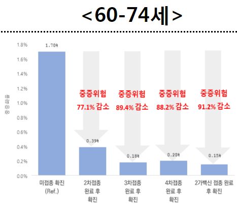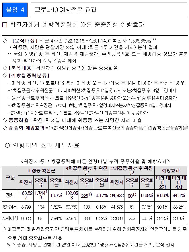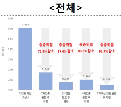 * ‘2가백신 접종 후 확진군’은 ‘미접종자 확진군’에 비해 중증(사망 포함)으로 진행할 위험이 91.7%, ‘4차접종 후 확진군’도 ‘미접종자 확진군’에 비해 중증 진행 위험이 83.5% 낮음