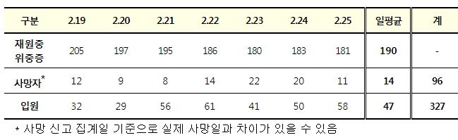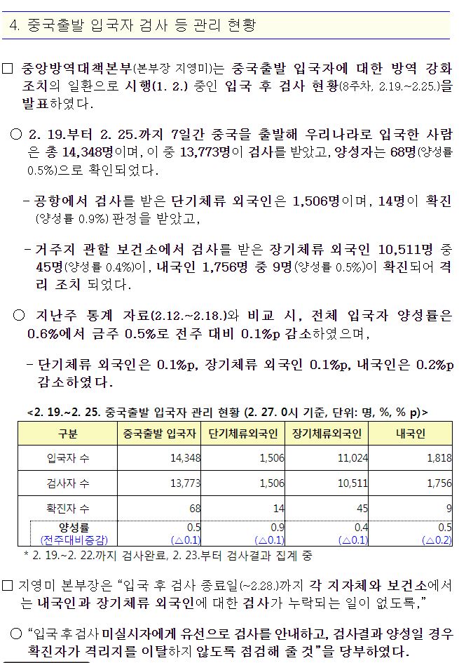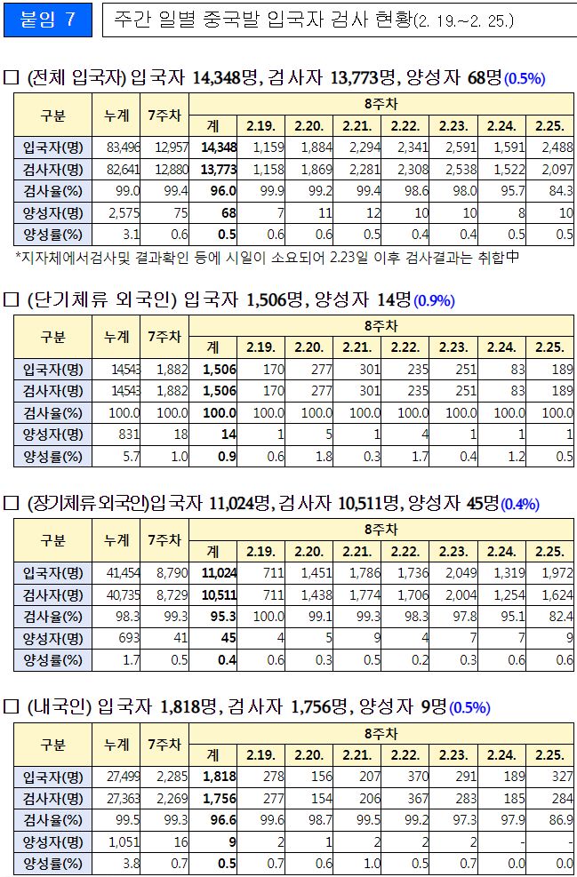 * 주간 일별 중국발 입국자 검사 현황(2. 19.~2. 25.)
