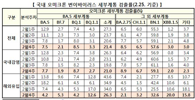 - BA.5(7.5%), BQ.1(8.5%), BQ.1.1(3.3%) 등을 포함하는 BA.5 세부계통은 21.4%(+0.8%p)로 확인되었고,