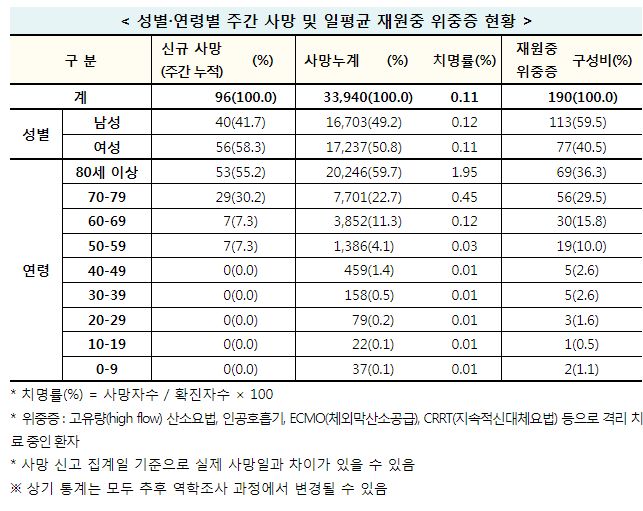 ※ 일평균 재원중 위중증 환자 중 50세 이상 174명(91.6%), 일평균 사망자 중 50세 이상 14명(100.0%)