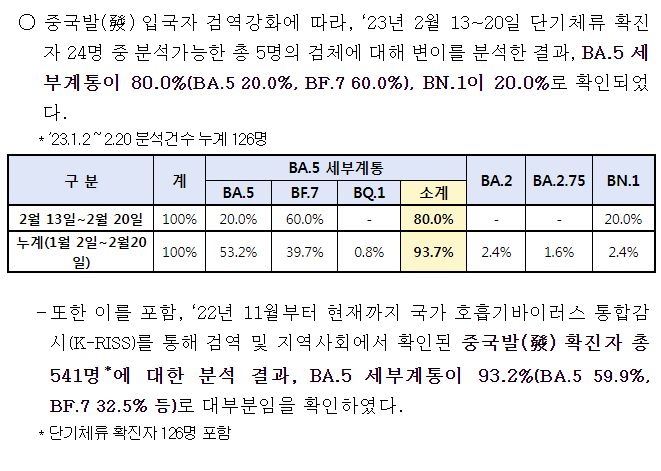 - CH.1.1은 6.5%(+0.8%p), 재조합 XBB.1.5는 3.0%(+0.9%p)로 확인되었다.