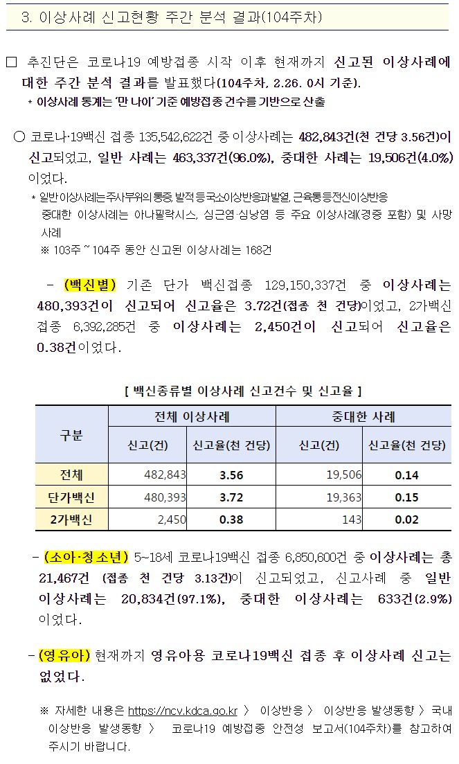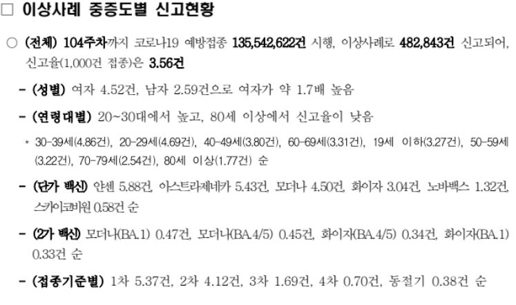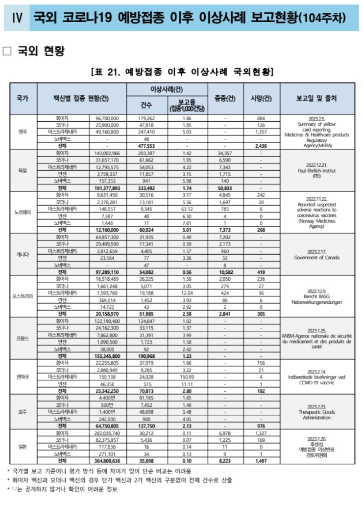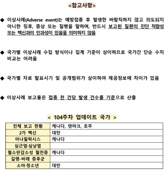 코로나19 예방접종 안전성 보고서(104주차)/ 국외 코로나19 예방접종 이후 이상사례 보고 현황(104주차)