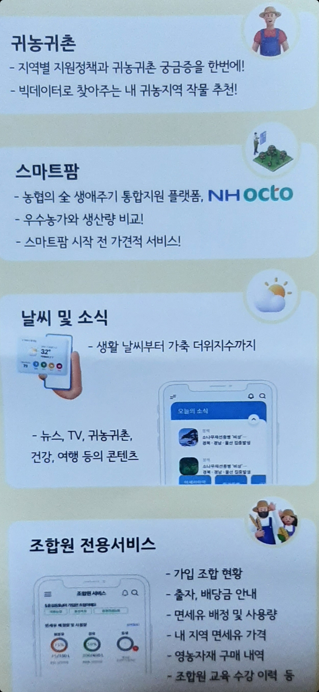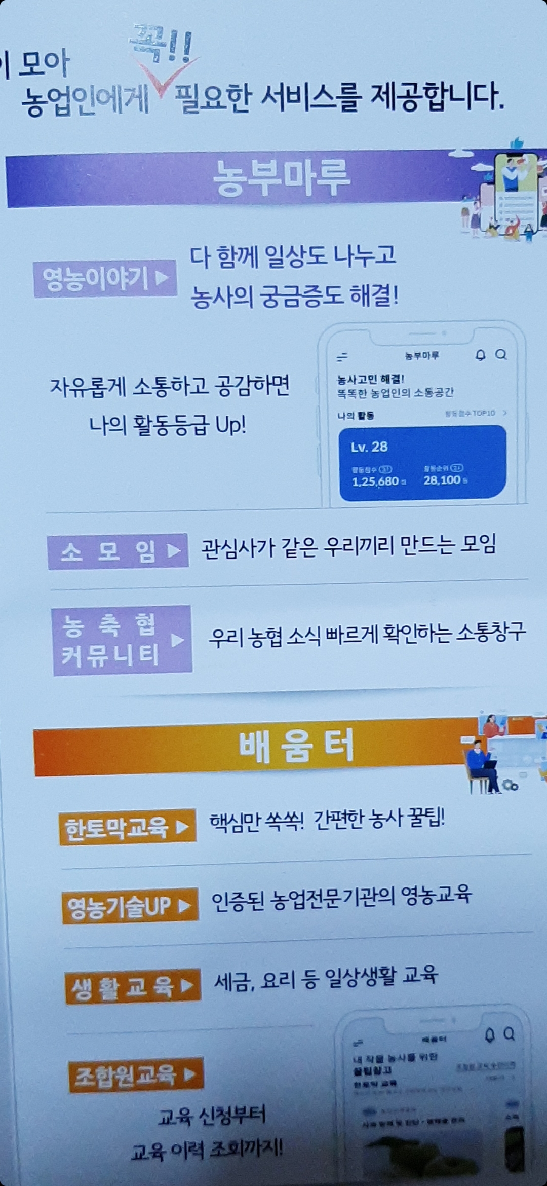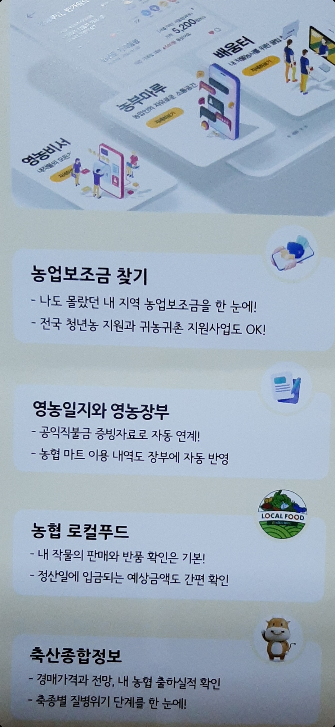 1.메인화면 : 날씨, 농산물 가격동향, 출하배차, 로컬푸드, 스마트팜, 영농일지, 축산종합정보, 보조금, 귀농귀촌, 영농이야기, 소모임, 배움터
